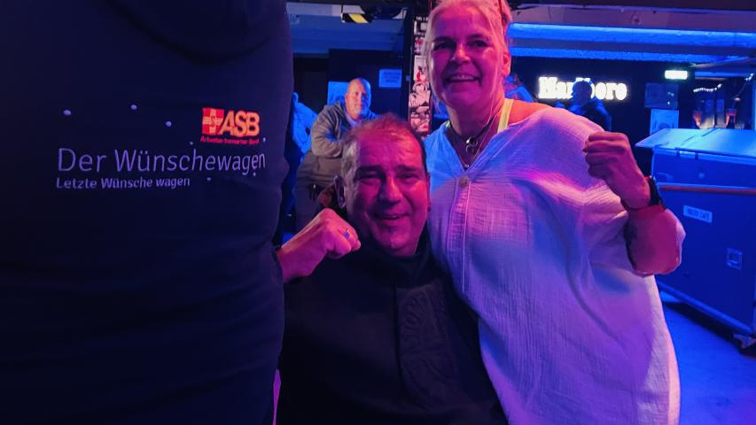 Gut gestärkt ging es zurück zu unserem Wünschewagen, der uns ins legendäre Riders Café brachte. Dort wurden wir schon vom Inhaber erwartet, denn für Rigo und seine Frau sowie uns Begleitende sollte der Einlass vor dem offiziellen Publikum stattfinden. Als Überraschung gab es nämlich noch ein kleines Zusammentreffen mit dem Sänger der Band Kuult! Die Texte der Lieder hatten die beiden durch die schwersten Zeiten gebracht, als unklar war, wie und ob Rigo auf der Intensivstation überleben würde. Es war ein großer Herzenswunsch, gemeinsam das Konzert zu erleben, denn nach fast 30 Jahren Beziehung hatten sie noch nie ein Konzert gemeinsam besucht.