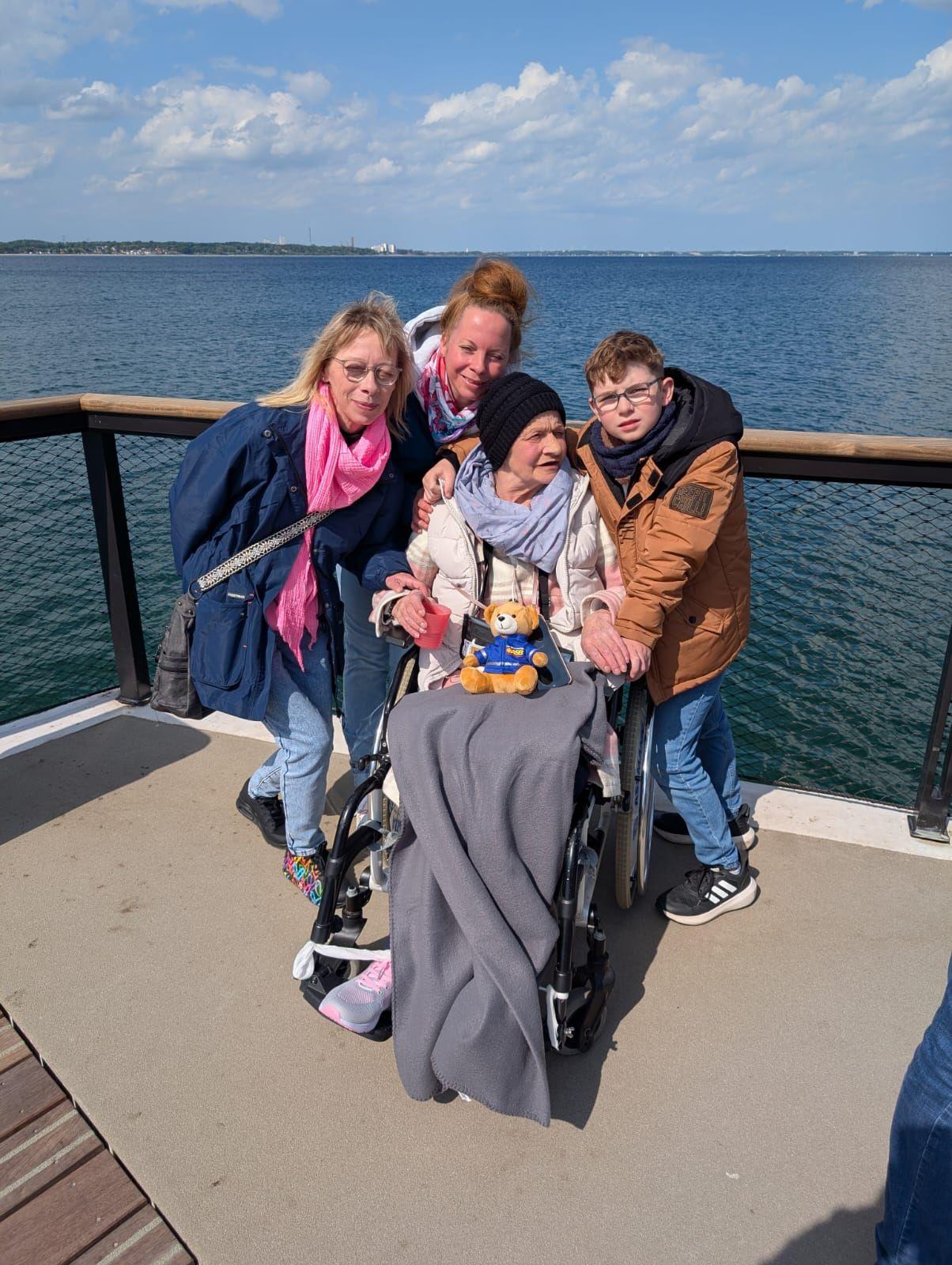 Wir wurden herzlich begrüßt und von den Palliative-Care-Schwestern in das liebevoll eingerichtete Zimmer von Frau B. begleitet. Die Aufregung war im ganzen Raum zu spüren – die Kinder und der Enkel waren schon da und warteten, dass es losgehen kann. Nach einem herzlichen Kennenlernen machten wir uns auf den Weg nach Scharbeutz zur neuen Seebrücke. Maxi, der Enkel von Frau B., wollte unbedingt bei seiner Oma sitzen. Wir zeigten ihm den Wünschewagen, und er ließ sich alle Technik genau erklären. Dann half er dabei, es seiner Oma so bequem wie irgendwie möglich zu machen.