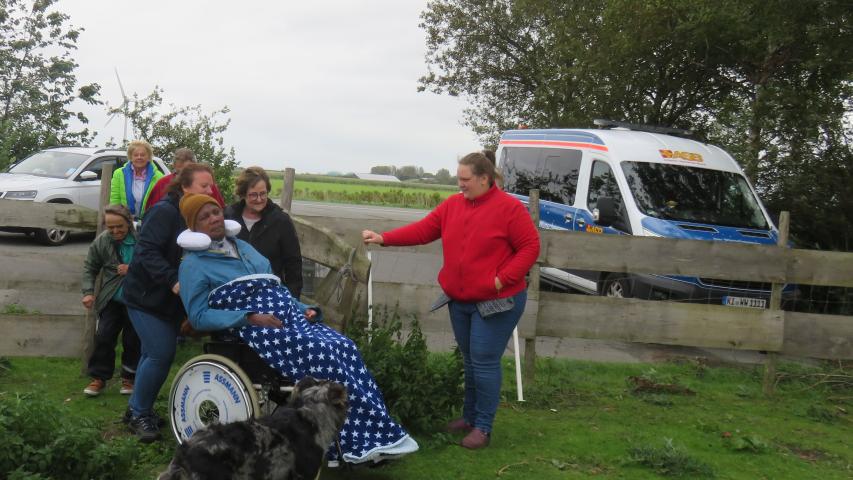 Pünktlich, wie es der Fahrtenplan vorsah, haben wir die Angehörigen Beate und Britta abgeholt und anschließend Kenneth, unseren heutigen Fahrgast. In kurzer Zeit haben wir uns ein wenig ausgetauscht und konnten uns auf die Fahrt einstellen. Kenneth war früher oft auf der Halbinsel Nordstrand und vor kurzem, als er noch reden konnte, äußerte er den Wunsch, auf den Alpaka-Hof und anschließend zum Strand zu fahren. Seine engsten Freunde haben an den Wunsch gedacht und wollten ihn mit uns erfüllen.