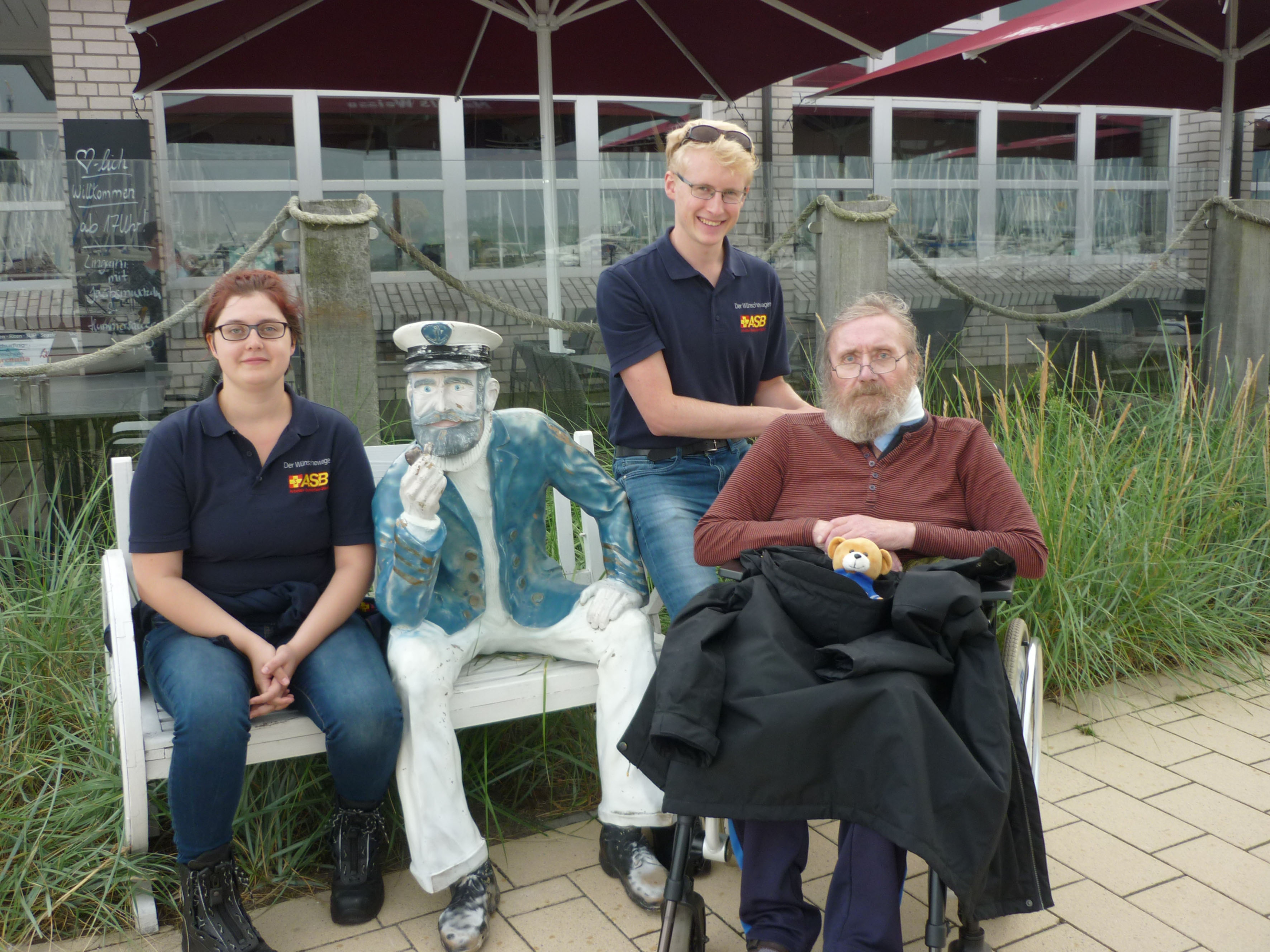Gemeinsam mit seiner vertrauten Betreuerin und einem herzlichen „Ahoi!“ seinerseits machten wir uns auf den Weg, die lange Reise von Flensburg nach Fehmarn zu bestreiten. Und was soll man sagen, die Sonneninsel machte ihrem Namen mit blauem Himmel und strahlendem Sonnenschein alle Ehre. Schon aus weiter Ferne konnten wir die Fehmarnsundbrücke erkennen und schon durften wir Herrn P. in seiner alten Heimat willkommen heißen. Mit leuchtenden Augen gab er uns zu verstehen, dass er die ganzen Straßen wiedererkenne und sich an die alten Zeiten zurückerinnere. Als erstes Ziel steuerten wir sein damaliges Wohnhaus an, doch oh Schreck – von seinem Haus war nicht mehr viel zu sehen, stattdessen erblickten wir eine große Baustelle. Aber das sollte seine Stimmung nicht trüben, kurzerhand legten wir gemeinsam ein neues Ziel fest: Den zum Ortsteil Burgtiefe gehörenden Yachthafen. Vor Ort angekommen, erblickten wir an den Stegen Segelschiffe soweit das Auge reichte. Mit dem Herzkissen unterm Arm und dem Teddy „Wünschi“ sicher in der Kapuze seiner Regenjacke verstaut, ging es dann die Yachthafen-Promenade entlang, immer in greifbarer Nähe zum Ostseewasser. Sich gemeinsam über die Eindrücke auszutauschen, gehörte dabei ebenso dazu wie schweigend in den eigenen schönen Erinnerungen zu schwelgen. Dem glücklichen Lächeln unseres Fahrgastes nach zu urteilen schien er von diesen jede Menge parat zu haben.